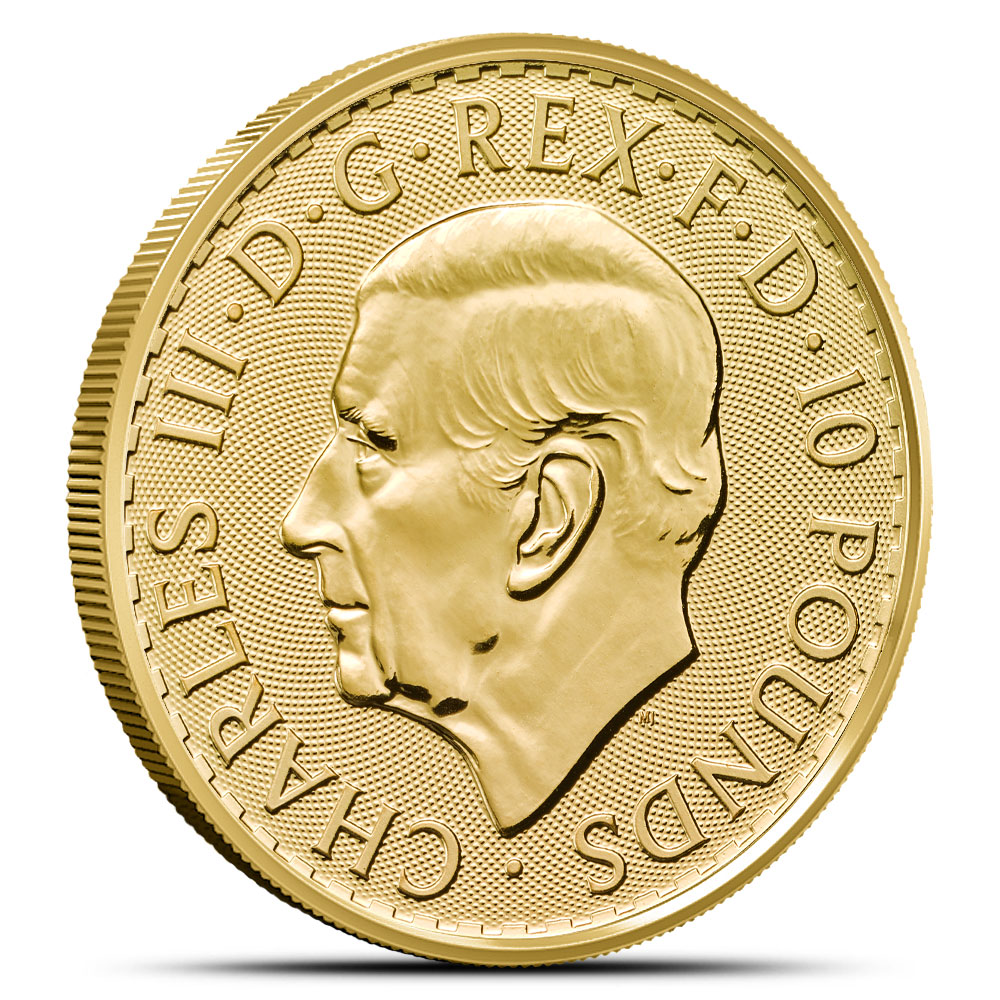 For the 2026 1/10 oz Gold Britannia Coins, the obverse carries the effigy of King Charles III. This is the first official portrait of the monarch to appear on British currency and was created in 2022 by Martin Jennings. The design presents the King in left-profile, without a crown.