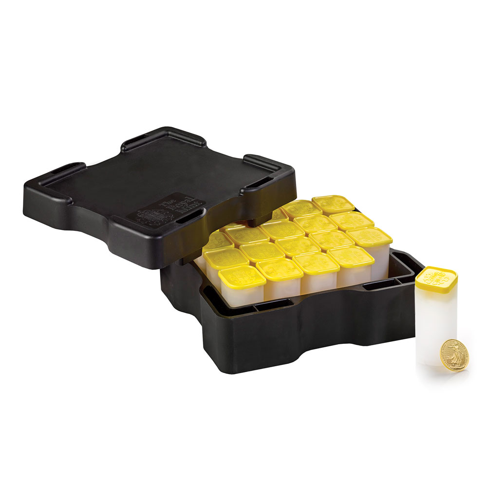 These 2026 1/10 oz British Gold Britannia Coins are available in either plastic flips for individual specimens or in acrylic tubes of 25 coins. All coins are in Brilliant Uncirculated condition. The enhanced security elements include motion texture waves in the background, tincture lines, a latent security mark, and micro-text engraving.