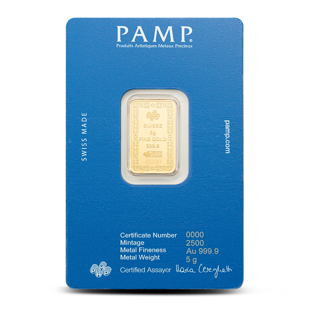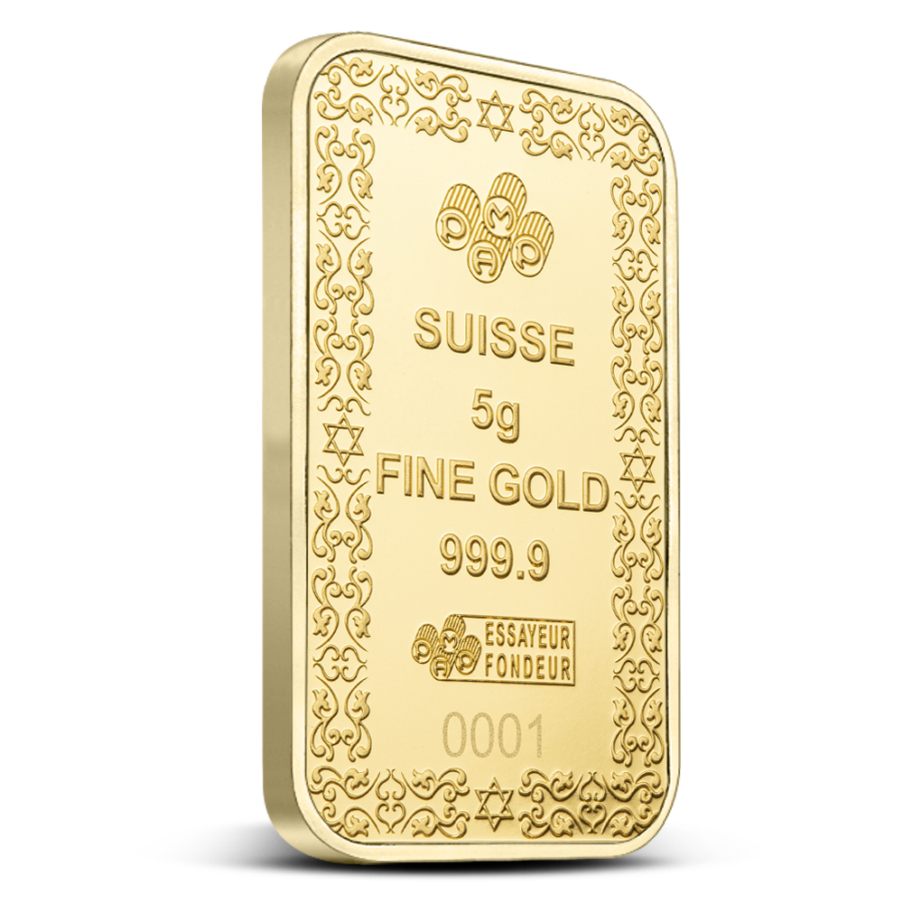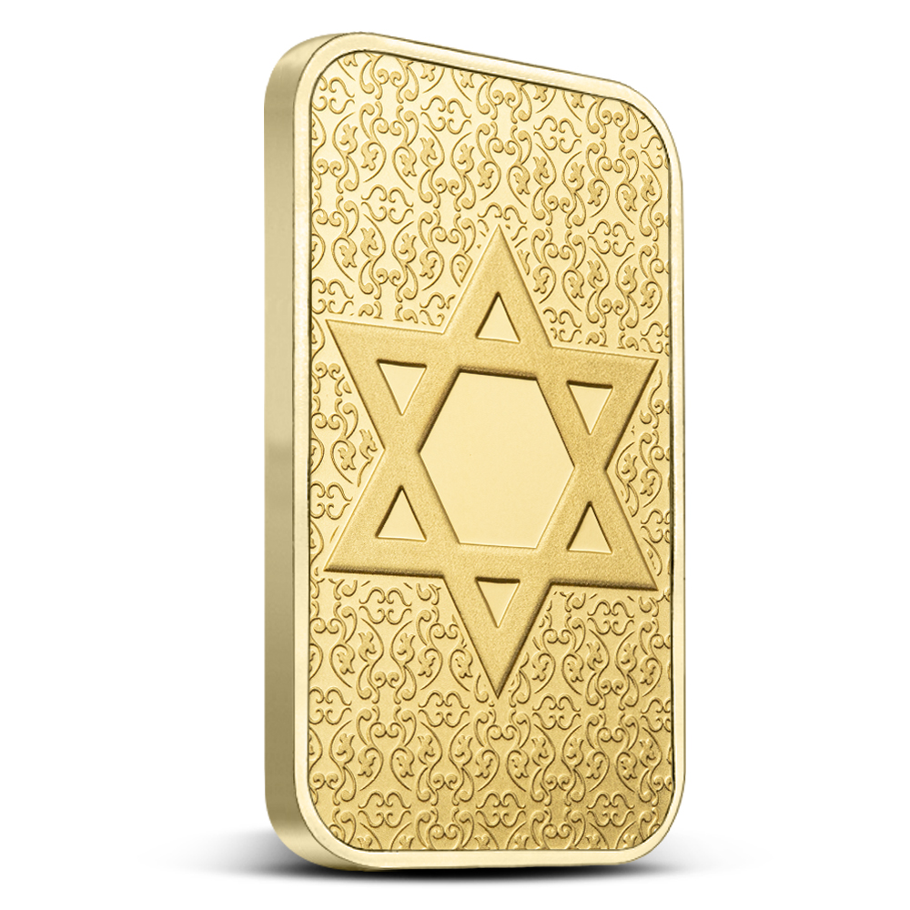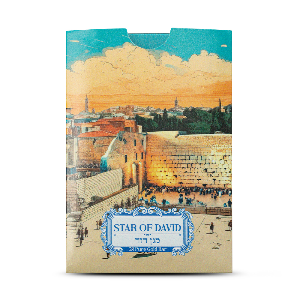 All 5 Gram PAMP Suisse Star of David Gold Bars come sealed in a CertiPAMP assay card featuring a depiction of the Western Wall and are presented inside a gift sleeve. The obverse of each bar is engraved with a unique serial number.